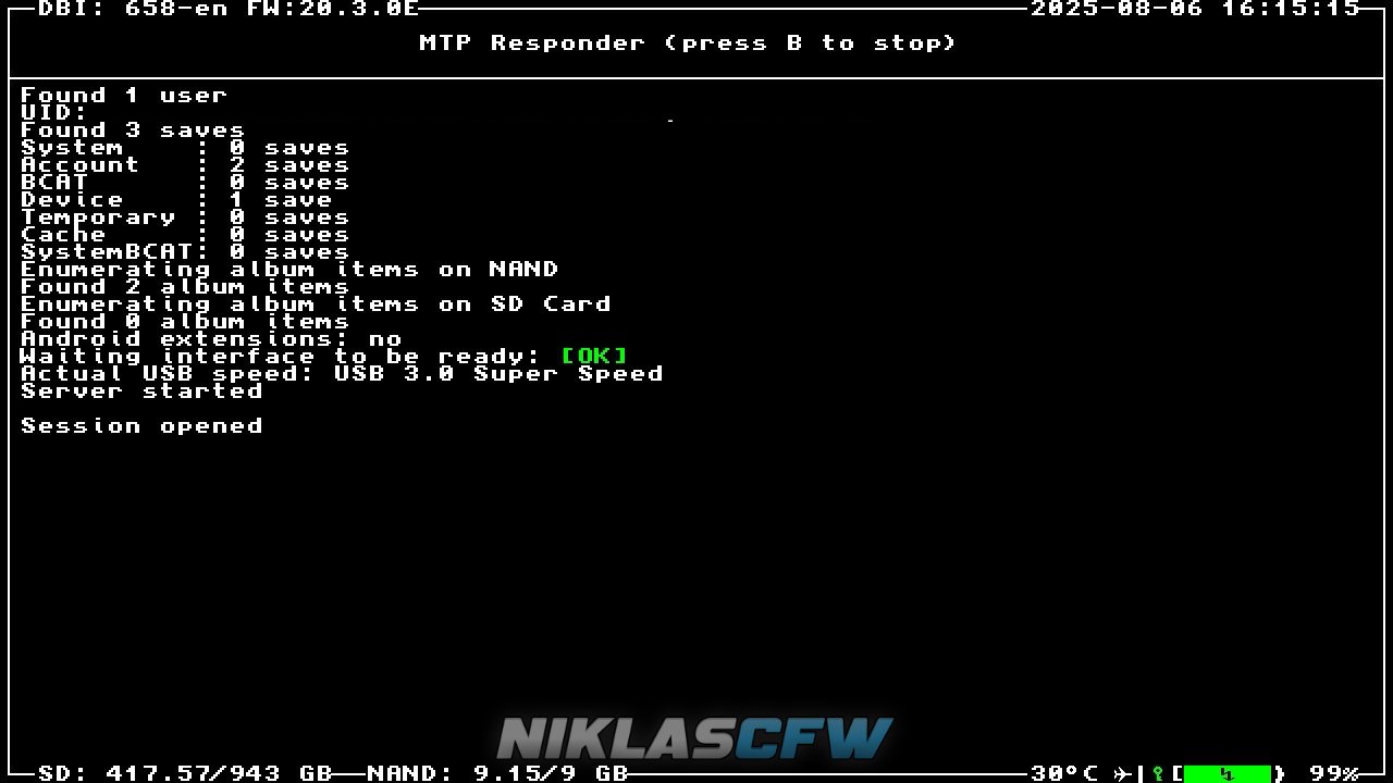 - Starte DBI per Titel Override (der Hintergrund von DBI ist dabei schwarz und nicht blau) auf der Switch