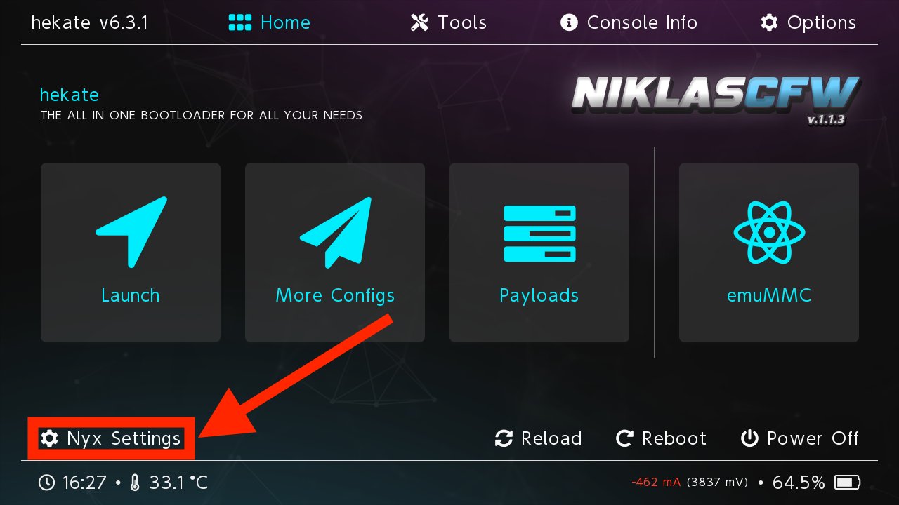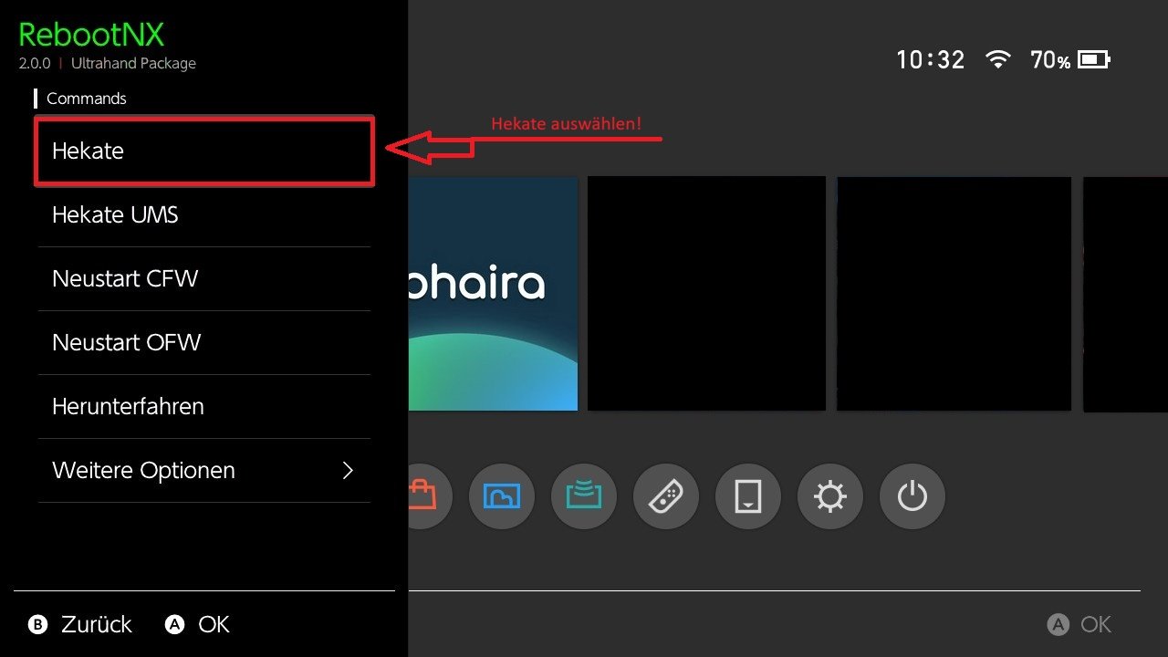 - Boote die Switch neu (Reboot NX > Hekate). Die Switch startet direkt in Hekate.