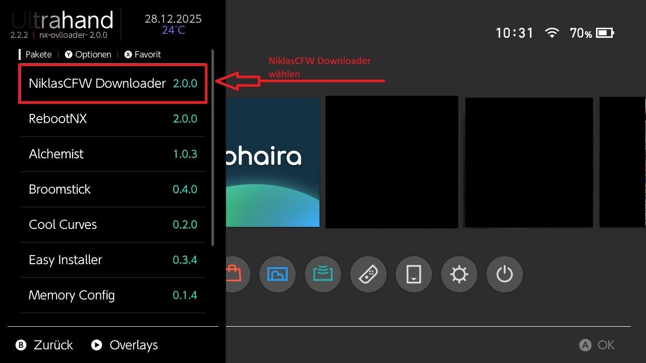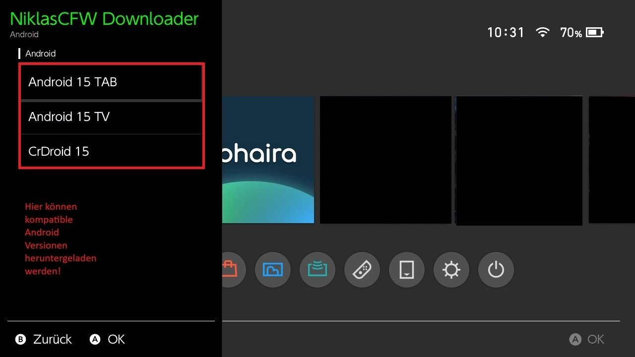 - Boote in deine CFW und lade die Android-Installationsdateien über Ultrahand (L und R und +)> Niklas CFW downloader >Android und/oder Linux herunter.
