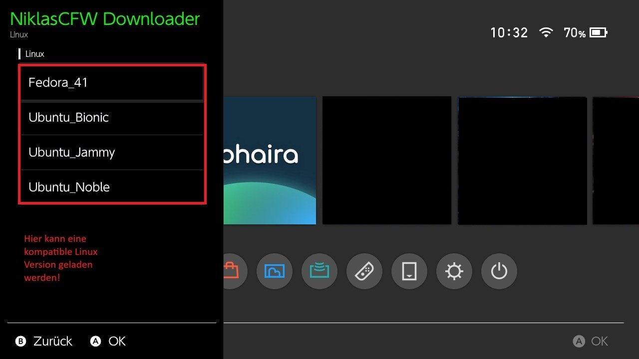 - Boote in deine CFW und lade die Android-Installationsdateien oder Linux-Installationsdateien über Ultrahand (L und R und +)> Niklas CFW downloader >Android und/oder Linux herunter.