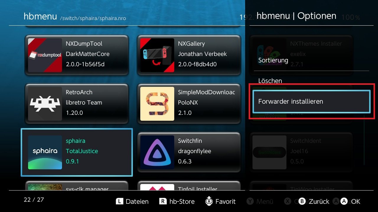 Klick auf Forwarder installieren, dieser wird nun installiert und ist auf dem Homescreen deiner Switch zu finden